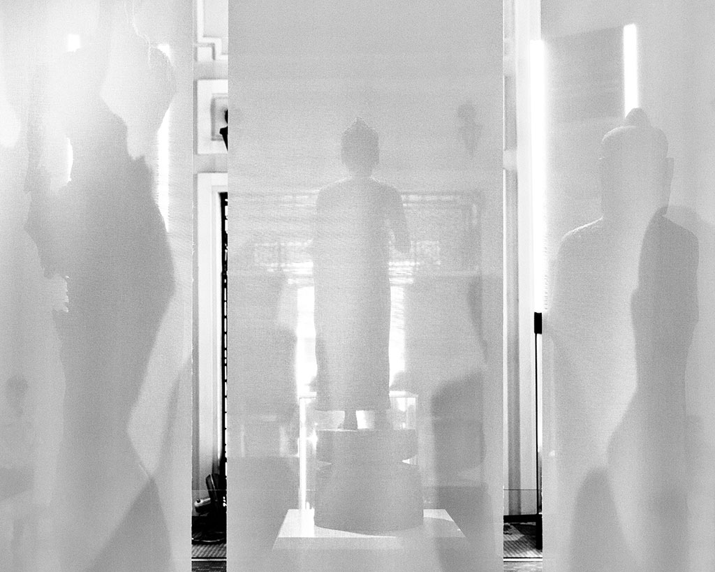 The exhibition “Seas of Silk” by research-based artist Quang deLam at Lotus Gallery features a rich and multi-layered scenography. Complementing deLam’s paintings is a curated series of statues from the Óc Eo civilization.